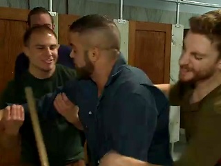 Pissed off janitor fucked in bondage by horny bathroom cruisers