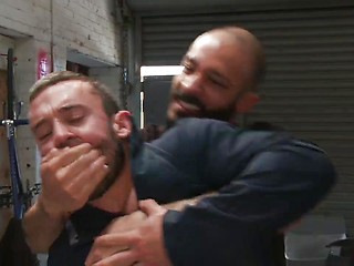 Muscled mechanic, bound, fucked from both ends, and doused with cum